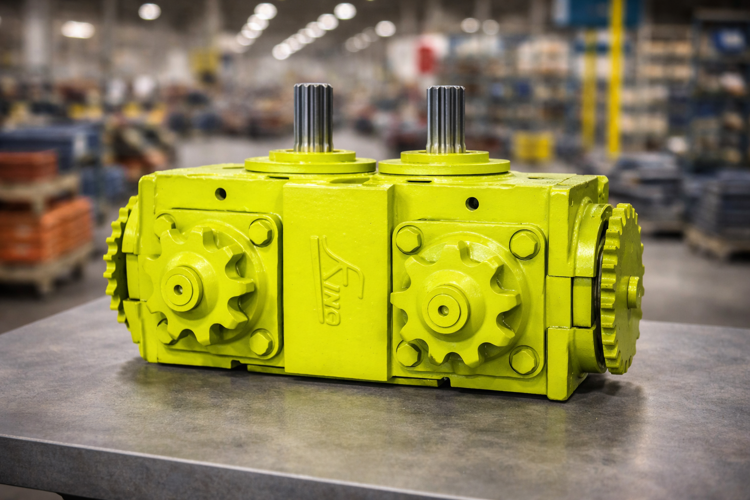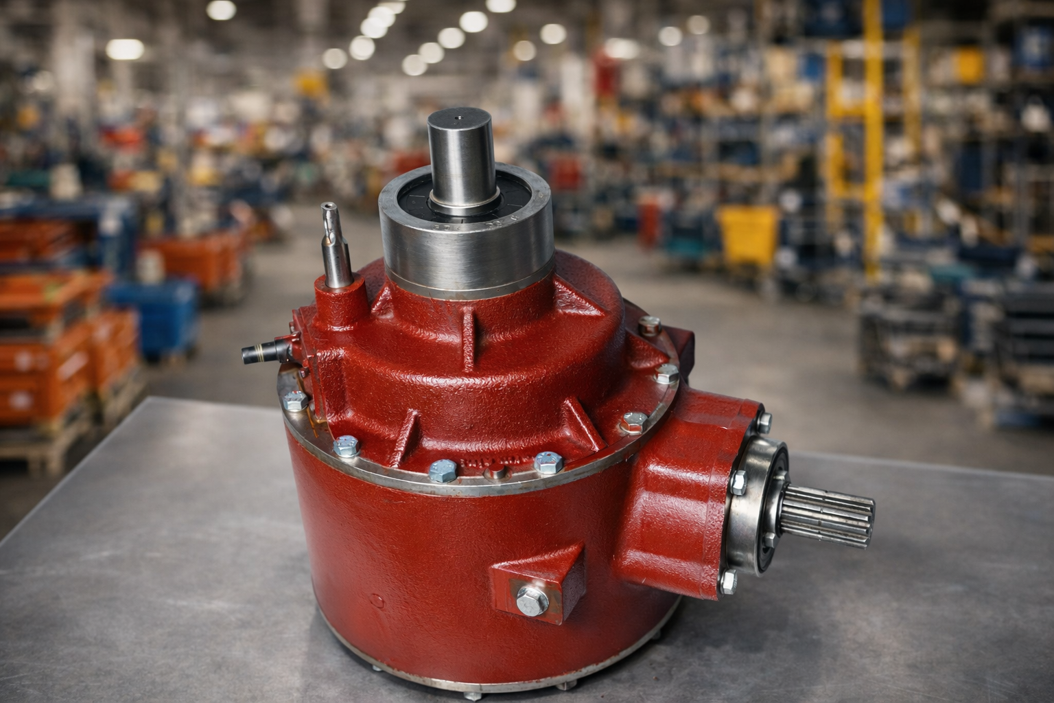 Double-stage reduction gearbox specially engineered for track harvesters, ensuring high durability, stable performance, and long operational life in demanding agricultural conditions.